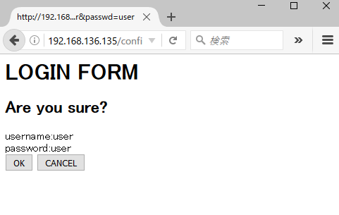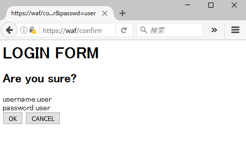 <!--?php session_start(); $name = $_GET['name']; $passwd = $_GET['passwd']; ?--> <h1>LOGIN FORM</h1> <h2>Are you sure?</h2> <form action="success.php" method="get">username:<!--?php echo $name; ?--> password:<!--?php echo $passwd; ?--> <input name="name" type="hidden" value="<?php echo $name; ?>" /> <input name="passwd" type="hidden" value="<?php echo $passwd; ?>" /> <input type="submit" value="OK" /> <input type="button" value="CANCEL" /></form>