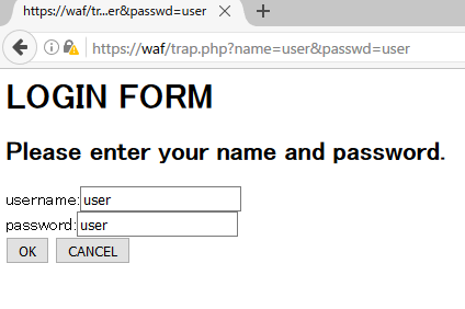 <!--?php session_start(); ?--> <h1>LOGIN FORM</h1> <h2>Please enter your name and password.</h2> <form action="xss.php" method="get">username:<input name="name" type="text" /> password:<input name="passwd" type="text" /> <input type="submit" value="OK" /> <input type="reset" value="CANCEL" /></form>・xss.php <!--?php session_start(); ?-->