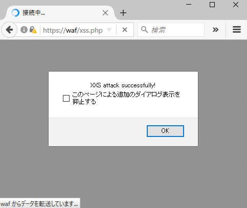 OKクリックすると、ウィルスがダウンロードされる仕組みとなっている・・・ということはありませんが、実際の XSS 攻撃では、OKをクリックさせて、転送サーバにあるウィルスをダウンロードさせるといったことが可能となります。